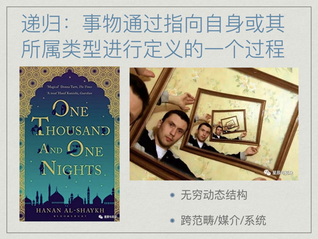 我们可以看到,人类的自然语言之所以有如此强大的表达能力,以至于「语言的界限,就是我的世界的界限」,就是因为递归和自指机制的存在。这也使得语言本身能够兼容多种模态的表达,例如,诗歌能以通感形式以一种感官表达另一种感官的感受。 除语言媒介的诗歌,以及更抽象的音乐外,在现代艺术之前,其它单一媒介,尤其古典艺术和造型艺术,往往诉诸表现自己媒介形式特征的内容和信息。但同样的,就如埃舍尔一样,若对自指和递归的运用,都实现表现媒介系统之外,或者试指涉系统之外其它媒介系统的效果。