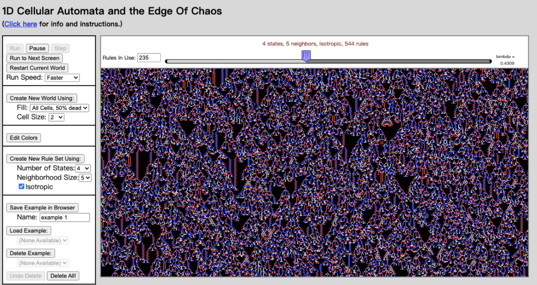 当λ=0.001,所有的细胞被吸引到一种固定的状态,这相当于我们上一节叙述的第一类细胞自动机; λ=0.2附近,系统在一些固定的状态之间周期的循环,这相当于第二类细胞自动机,的细胞自动机比的在开始的时候具有更复杂的结构; λ介于0.3大约到0.6之间的时候,会出现相当复杂的结构。这些结构既不属于固定的周期或者固定值,也不属于完全的随机,因此这些细胞自动机属于第四类即「复杂型」。并且,随着的增长,复杂结构的维持时间也会变得越来越大; - λ>=0.6的时候,复杂的结构消失,系统将被吸引于一种完全随机的混沌状态。