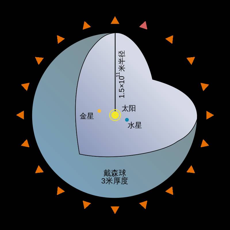 戴森球(英语:Dyson Sphere)是弗里曼·戴森假想出的包围母恒星的巨大球形结构,它可以捕获大部分或者全部的恒星能量输出。戴森认为戴森球是长期生存技术文明对于能量需求增长的必然需求,并认为寻找其存在的证据可以引导发现的先进和智慧的外星生命。不同类型的戴森球和它们的能量收集能力将对应于在卡尔达肖夫指数水平上的技术进步。自从该概念提出以后,诸多科幻作品里提出的包围恒星的人工建筑都被冠以“戴森球”之名。后续的设想认为戴森球上不仅有太阳能电站,还有人类殖民地和工业基地存在。图为戴森球的一种变体。这种大规模人造物会大幅度改变恒星的光谱。来源:维基百科