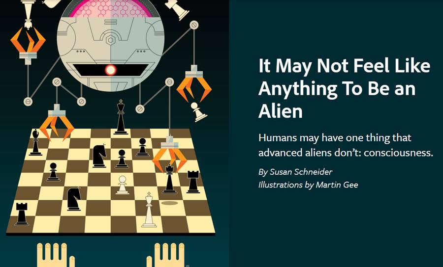 但是,有着大量智能差异的物种,有不同基质生成的物种,怎么认识到彼此的意识呢?地球哲学家思考,是否意识限制于生物现象。超级智能 AI 是否也有类似的哲学,可以提出类似我们“生物体意识问题”,会不会问是否我们有体验这么一个东西。