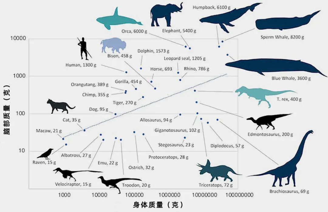 恐龙硕大的身体进化得很好,但脑就是另一回事了。恐龙的确表现出一种微弱的趋势,随着时间的推移,它们的脑略微增大。侏罗纪的恐龙,比如特异龙、剑龙和腕龙的脑都很小。到了白垩纪晚期,也就是大约8000万年后,暴龙和鸭嘴兽已经进化出了更大的脑。但是,尽管尺寸变大,霸王龙的脑也只有400克重。一只伶盗龙的脑重约15克。作为比较,人脑的平均重量是1.3千克。