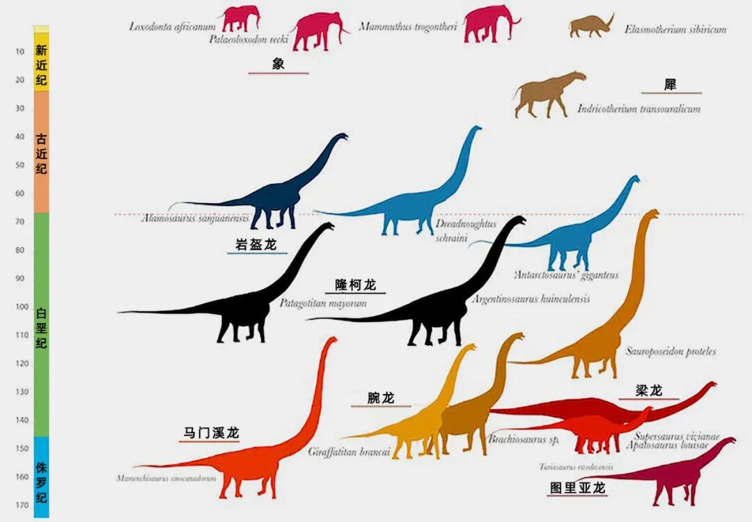 这些动物的共同点是,它们都是蜥脚类恐龙。关于蜥脚类恐龙的解剖特征中的一些东西,包括肺、具有很高的强度-重量比的空心骨骼、新陈代谢或者所有这些东西,释放了它们的进化潜力,让它们以一种在陆地动物中“前无古人后无来者”的方式变大。