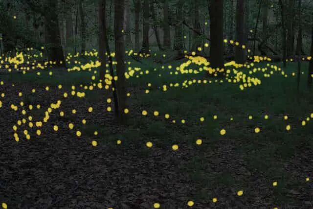 起初,它们似乎是无组织的,但很快就出现了几对“步调”和谐的萤火虫,它们以相同的节奏每秒闪动两次。成对的萤火虫聚集成“三重奏”“五重奏”,仿佛突然间,整个森林都以一种共同的闪烁节拍在跃动。萤火虫群已经同步了。