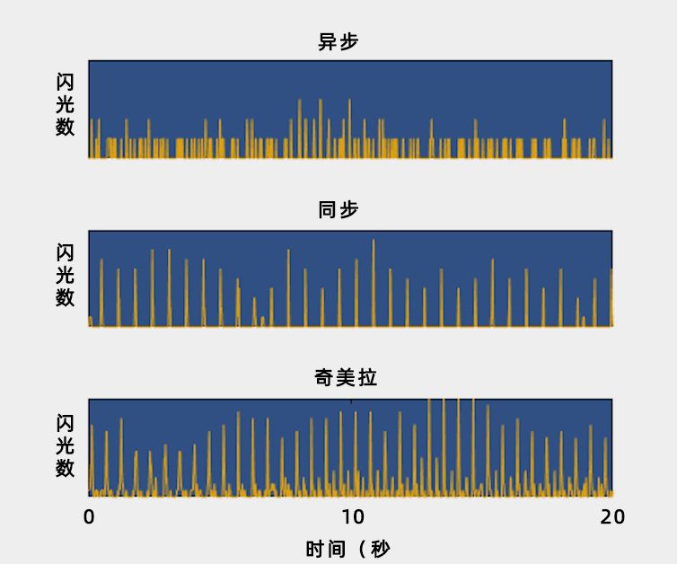 在随后的分析中,同步性在数据中表现为闪烁数量与时间关系图中的尖峰。这些峰值表明,大多闪烁发生在同一时刻。当它们不同步时,曲线看起来是不规则的,就像涂鸦一样。