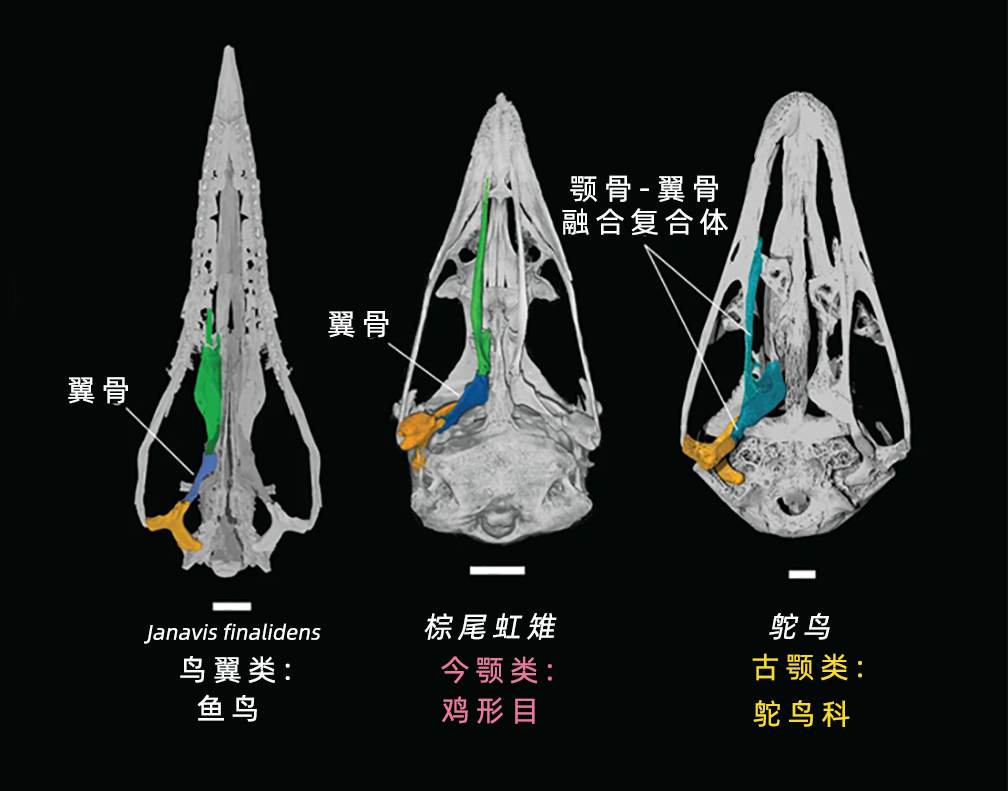 研究人员得出结论,这种和火鸡一样的未融合的“今颚”,其实在鸵鸟及其近亲的“古颚”之前就出现了。出于某种尚不清楚的原因,鸵鸟和近亲的融合上颚,一定是在之后的某个时间段“逆向”进化的