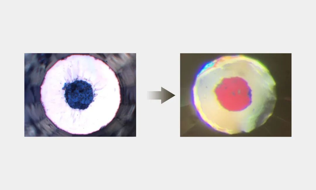 当金刚石压砧压缩新产生的镥-氮-氢化合物时,蓝色的晶体变成了粉红色,电阻降至为零。(图/RANGA DIAS)