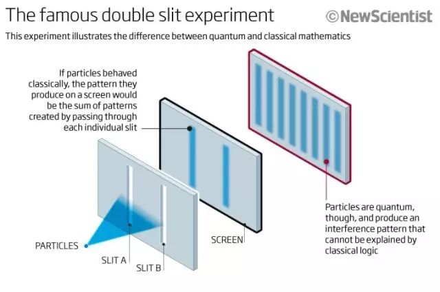 △ 著名的双缝实验。中间的探测屏幕代表粒子是经典时的行为,但事实上粒子是量子的,因此会产生干涉条纹(红色框)。(图片来源:NewScientist)