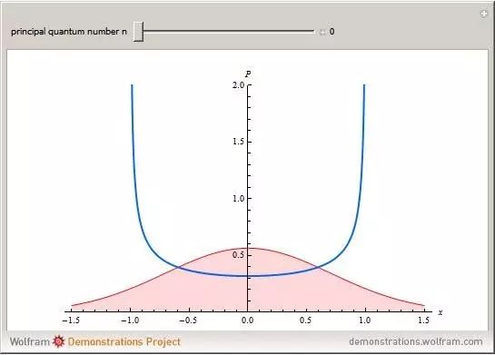 △ 红色区域代表量子谐振子的概率密度,蓝色曲线则表示经典概率分布。在这个情况中量子数n=0.(图片来源:Wolfram)