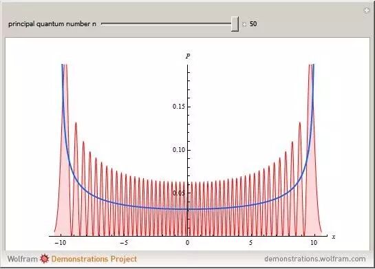 △ 量子数n=50。随着量子数的增加,量子效应逐渐消失,越来越向经典靠近。(图片来源:Wolfram)