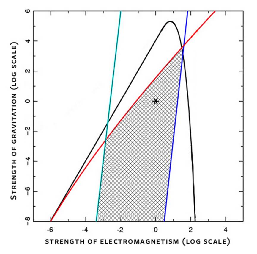 设定参数范围:即使电磁力或引力比现实情况更强或更弱,宇宙依旧能够适宜生命居住。图中的阴影区域显示了适宜生命存活的参数范围。星形记号表示我们这个宇宙的参数情况;横纵坐标分别以对数形式显示电磁力与万有引力的大小。相关限制参数分别为:能够发生核聚变反应(黑色曲线以下的区域);拥有足够悠久的寿命以让复杂的生命有足够的时间演化(红色曲线以下的区域);足够热,以支持生物圈的形成与存在(蓝色曲线以左的区域);体积不能超过它们所处的星系(蓝绿色曲线以右的区域)。