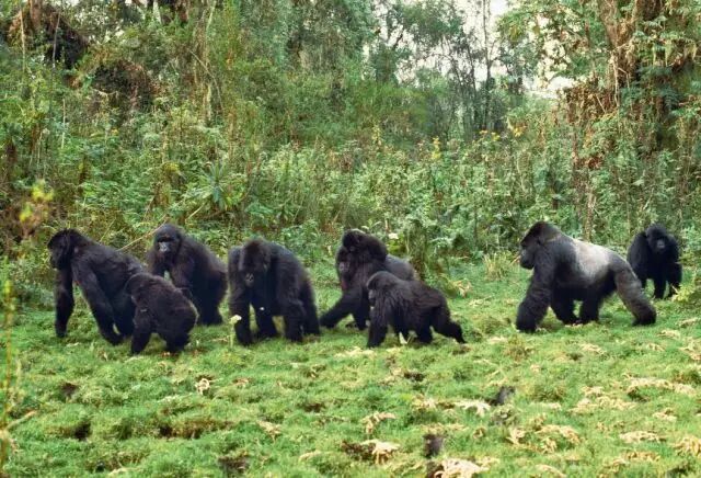 在卢旺达,一只雄性银背山地大猩猩(右)带领着它的大部队。大猩猩是一夫多妻制的,以小群体生活,包括一个占主导地位的雄性、多个雌性配偶以及它们的后代。