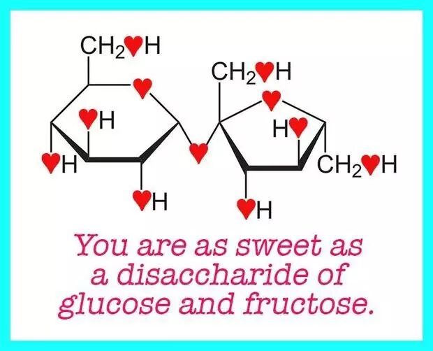 “你就像葡萄糖和果糖的二聚体一样甜美。”克里斯汀(Kirstin)用化学式画出了一张(literally)甜得齁死人的情人节卡片。分子中所有的氧原子都被改成了一颗红心,少女心满满啊。”