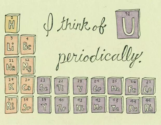 萨拉·怀特(Sara White)设计了这个以元素周期表为主题的情人节贺卡,上面写着一句话:“我周期性地总‘铀’时候会想你。”(“I think of U periodically.”U代表you,同时也是周期表上的92号元素)