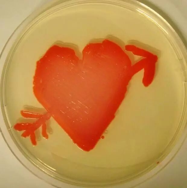里尔大学的赛巴斯提安(Sébastien Bontemps-Gallo)教授在培养皿中做了一个情人节礼物。他在琼脂培养基中用微生物粘质沙雷氏菌产生红色色素做了个心被丘比特射穿的图案。