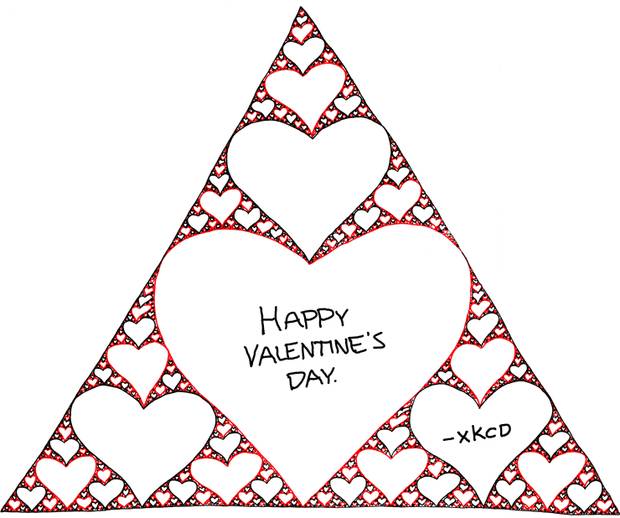 爱的分形图——兰道尔·门罗(Randall Munroe)将著名分形图案“谢尔宾斯基三角”中无限的三角形替换为心形,真的是“浪漫无限”。