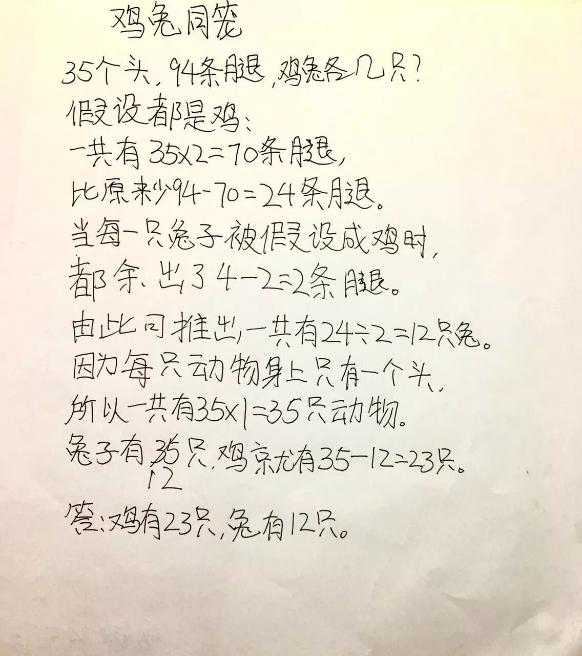 她的解法是对的。这种解法被称作“假设法”。其出发点是,假设全都是鸡(或者兔),也就是她在题目之后写下的第一句话。然而,这个方法并不好理解。很可能她的母亲看到这句话就迷糊了:兔就是兔,怎么能假设兔是鸡呢?可以想象,如果老师在课堂上只教这种解法,效果可能不好。