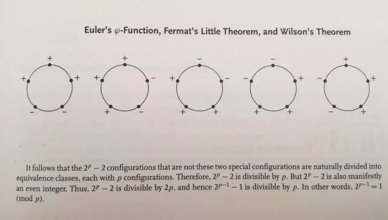 除了这两个特殊构型,我们将其余的2p-2个非特殊构型划分为等价类。如上所述,每个非特殊构型所在的等价类正好包含p个构型。因此,2p-2能被p整除。例如,p=5时,有32-2=30个非特殊构型,并有6个等价类;这时25-2确实能被5整除。