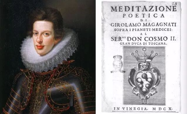 在《星际使者》发行的当年,伽利略的一位朋友、威尼斯玻璃制造商和诗人马伽格纳提(Girolamo Magagnati)出版了一本奉献给科西莫二世的诗集,封面上有意将“科西莫”(Cosimo)印成“宇宙”(Cosmo),又在美第奇家族的纹章上面加了一顶王冠,其上有五颗星星,代表木星和它的四颗卫星(见下右图)。1610年5月21日,伽利略将此书寄给科西莫二世的秘书威塔(Belisario Vinta),不久他就被召唤到佛罗伦萨的托斯卡纳大公府。