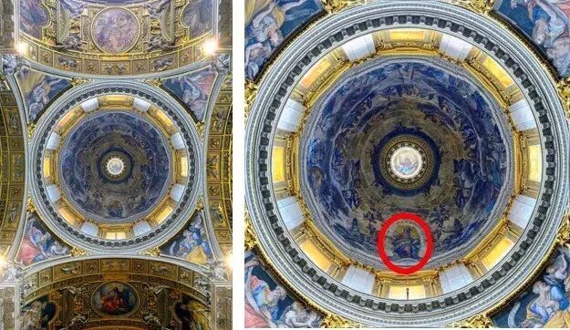 罗马圣母玛丽亚大教堂保罗厅穹顶,卡尔迪绘制的圣母在右图中由红圈标出。