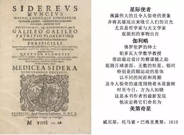 3月12日,伽利略出版了报告其用望远镜观测月亮、木星以及其他天体的《星际使者》,第一版500册一经推出即告售罄,伽利略也名声大噪。在此之前的2月13日,伽利略还曾致信科西莫二世,透露自己的新发现并询问可否以“科西莫”或“美第奇”来命名木星的卫星。因为美第奇家族这一代正好有四位兄弟,最后决定把四颗星统称为“美第奇星”(Medician Stars)。下面是伽利略描述木星及其卫星的亲笔信和《星际使者》第一版的封面,该书用“新拉丁文”即当时流行的意大利文写成,右面的译文主要参考徐光台的中文译本。