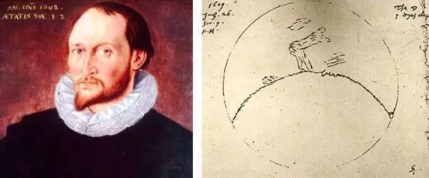左图:无名氏绘制的据说是哈略特的画像(c.1602),现存牛津大学三一学院;右图:哈略特绘制的月面图,图上注明的日期是1609年7月26日,现存英国西塞克斯档案馆(MS  HMC, 241/IX, fol. 20)。