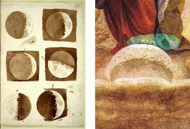 左图:伽利略绘制的月面图,水彩画,现存意大利国家图书馆(Ms. Gali. 48, c. 28r);右图:卡尔迪《圣灵感孕》局部,穹顶壁画,现存罗马圣玛丽亚大教堂。