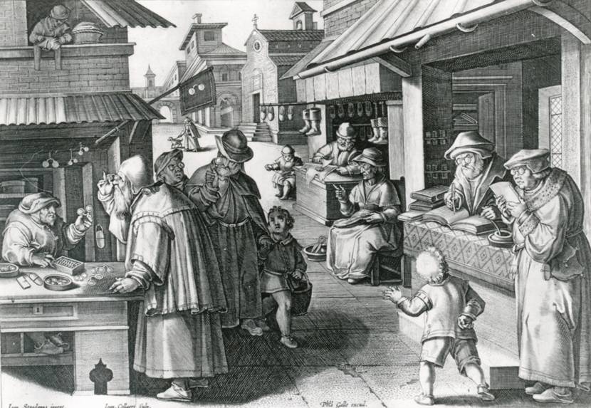 在此题名为《新发现——眼镜》(Nova Reperta-Conspicilla)的版画中,街道右边是书写铺和鞋铺,左边是眼镜铺,店主似乎可以根据顾客的视力情况提供不同类型的镜片。画面中的其他成年人全都戴着眼镜,或书写或阅读或在试镜,既有双目镜也有单目镜,从店面伸出的招牌旗帜上还有个醒目的眼镜图案。在这条商业街的尽头可以看见一座教堂,是否可以将它视作马克斯∙韦伯论题(新教伦理与资本主义精神)的一个形象注脚呢?这一说法难免有点牵强,不过画中传达的信息是明确的:在16世纪末的尼德兰,佩戴和制作眼镜已经是非常普遍的事情了。