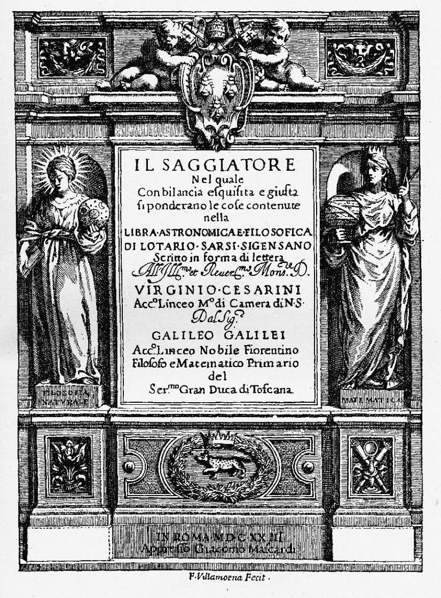 1623年,伽利略在罗马出版了《试金者》(The Assayer,意大利文Il Saggiatore),系统地阐述了他的哲学观和方法论。他质疑亚里士多德学派的权威,认为要把结论建立在实验与观察的基础上,又提出“大自然这本书是用数学语言写成的”,从而极大地促进了科学从形而上学和宗教中解放出来。