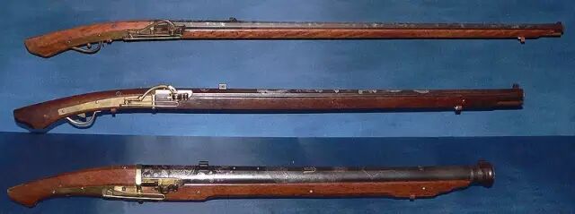 火绳枪,明代称鸟铳,有扳机,比之前的火器先进许多。