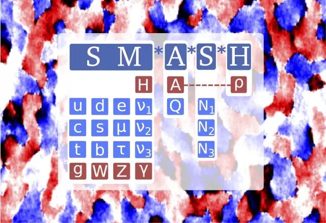 SMASH利用了“跷跷板机制”解释了中微子的质量问题。它假定存在尚未被发现的、质量远大于电弱能标的重中微子(即“N₁、N₂、N₃”),这样目前已知的三种中微子的微小质量就可以得到很自然的解释。同时,这些中微子会更偏向衰变成物质,而不是反物质,因此也解释了为什么这个宇宙是由物质主宰的。(可进一步阅读: