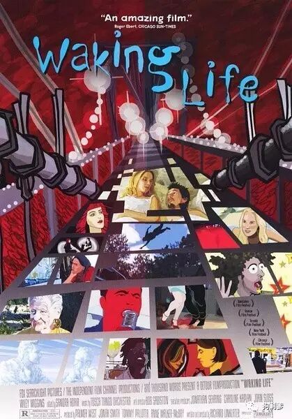 (7)《半梦半醒的人生》(Waking Life),动画片,2001年上映;由《爱在黎明前》三部曲的两位主演朱莉·德尔佩和伊桑·霍克配音。影片描述了一个年轻人无法从一系列相关联的梦中醒来。在梦里有许多人物向中心人物暗示了生活和死亡的真谛。