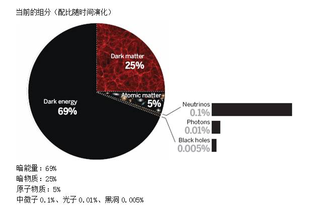 暗能量占宇宙质能密度的69%,暗物质占25%,“普通”的原子物质占5%。其他可观测的次要成分包括:三种中微子至少占0.1%,宇宙微波背景辐射占0.01%,黑洞不少于0.005%。