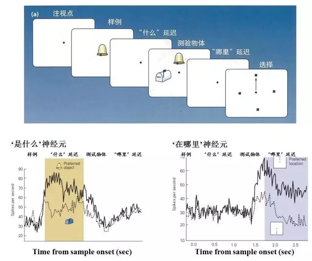 再把工作记忆的实验做得更复杂些,做两个工作记忆的串联。还是用猴子做试验,一开始让猴子关注电脑屏幕中间的点,然后给它看一个位于屏幕中央的铃的图像,接着有一段几秒钟延迟,再呈现给它两个图像:邮箱和铃,但这时铃的图像已从中间位置被移到正上方位置。再延迟几秒让猴子做动作,它会准确无误地选择处于正上方位置的铃,这里产生了两个工作记忆。在记录前额叶神经元放电的时候,会发现有一组神经元专门用来感知“是什么”的信息:只有当猴子看到铃时,放电频率才会增加,看到邮箱时放电不会增加;另外一组神经元则对“在哪里”的信息起反应:只有当猴子看到图像在屏幕上方时,放电频率才会增加而在屏幕任何其他部位时,放电不会增加。当把两个连续的工作记忆连起来,就可以知道一个特殊的物体在什么地方。