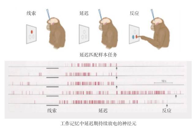工作记忆往往伴随着前额叶神经元的延迟性持续放电。再来看一个用猴子做的实验。先在猴子大脑前额叶插入一个电极,给猴子看一个红色的圆,同时记录猴子的神经放电,然后停顿几秒钟,即形成一个延迟,不给它看。这时它的大脑前额叶在储存、处理这个信息,当下一次再给他看的时候,则给它看两个点:一个没有看过的蓝色的圆和一个已经看过的红圆。经过训练,这个猴子会精准无误地选择那个红色的圆,而不选择蓝色的圆,这称为滞后样本配对(delay matching to sample),是一个典型的工作记忆的实验。用磁共振方法可以看到,在滞后的那几秒钟内,猴子的大脑前额叶被激活了。