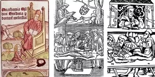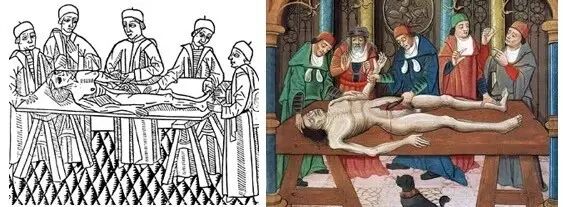 蒙迪诺《人体解剖》不同版本中有关解剖学课的插图。左:美国国家医学图书馆1493年藏本;中:罗斯托克大学图书馆1513年藏本;右:巴黎Lotrian et Janot 1532年本 (图片来源:Wiki,Schumacher 2007)