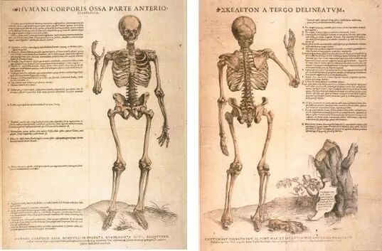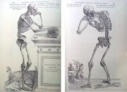 《人体构造》中描绘骨骼的插图(图片来源:Vesalius 1543)