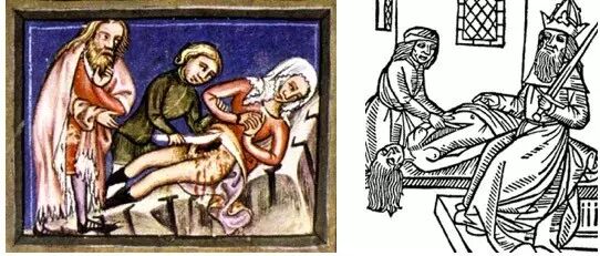 罗马皇帝尼禄(Emperor Nero,37-68 AD)是个声名狼藉的暴君,由于曾经残酷迫害基督徒和犹太人,后来的历史学家给他添加了许多匪夷所思的罪行,其中最骇人听闻的就是他与生母小阿格里皮娜(Julia Agrippina,15-59 AD)乱伦又将其杀害的传说。13世纪法国教士纪尧姆(Guillaume de Lorris,c.1200- c.1240)等人编写的长诗《玫瑰传奇》(Roman de la Rose)是一种流传很广的文献,内中就包含尼禄杀害自己母亲并将其解剖的描述。这本奇书有多个羊皮纸绘图抄本传世,下面是其中两种有关这一情节的插图:左图是海德堡大学所藏抄本中的墨水彩绘,大约完成于1410年,图中的小阿格里皮娜仍然活着,与之相配的诗文称,残暴的尼禄正在观察屠夫剖开母亲的腹腔,以便看看自己是从哪里来的。右图是巴黎藏本中的木版画,大约完成于1494年,图中的尼禄手持象征权力的宝剑,正在监督女医剖开母亲的胸膛。