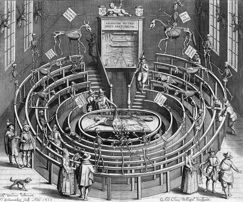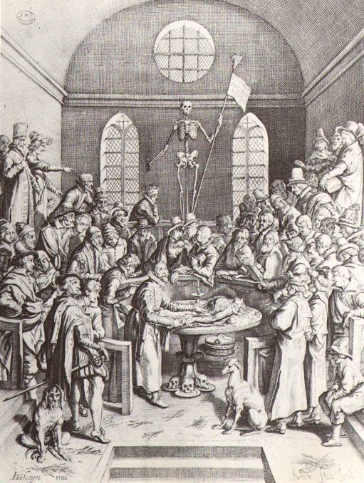 下图提供了17世纪初莱顿大学解剖学教室的内景:整个教室呈圆形,中间是演示用的解剖台,由下至上共有六排同心圆的坐席,坐席之间和四周墙壁上都有动物和人体的骨骼,正面墙上的壁橱里陈列着各种解剖学器具,最前面的一对骷髅代表亚当和夏娃,他们中间还可以看到智慧树与蛇,其余骷髅大多擎着旗子,旗上用拉丁文写着不同的箴言,大多与死亡有关,例如左上角的那面旗上的文字与上图完全一样(“死亡是人类的最终归宿”),右上第二面旗上的文字是罗马诗人荷拉斯的诗句“我们不过是尘土和阴影”(Pulvis et umbra sumus)。
