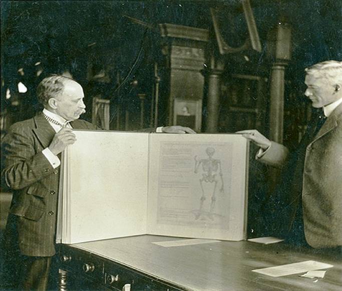 奥斯勒教授(左)和牛津大学博德利图书馆所藏《解剖六图》仿古本(1912年7月)(图片来源:McGill University Library)