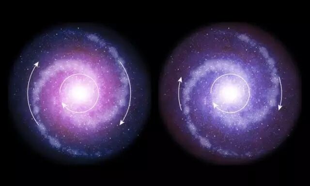 我们看到的闪闪发亮的恒星,发光的气体和尘埃云都是由普通物质组成的。但是暗物质却不辐射、吸收或反射光,只能通过引力的效应来观测它的存在。如果只有可见的普通物质存在于星系之中,那么就无法维持星系的高速自转,星系就会分崩离析。但事实却并非如此,因此天文学家断定有一种不可见的暗物质存在,提供着额外的引力维持着整个星系。