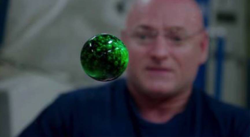 在轨运行的宇宙空间站中的液滴。由于没有外力的作用,液滴静止地悬浮在空间站的舱室里,在表面张力的作用下,形成一个完美的球形。如果宇航员不吹一口气,它自己是不会动的。