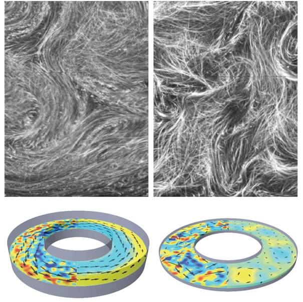 带有微管结构的流体由普通湍流变为宏观平行流的过程。当流道较浅时,分子马达驱动下的微管系统杂乱无章(右上),细小的湍流各自为战(右下),组成混乱、随机的流动格局。然而,当流道加高时,更多的微管与流道表面结合,形成相互平行的系统结构(左上),而这些微管形成的湍流竟然可以相互作用,推动周围流体沿着圆盘平行绕圈(左下),实现宏观上的、携带大量动能的自主主动流动!