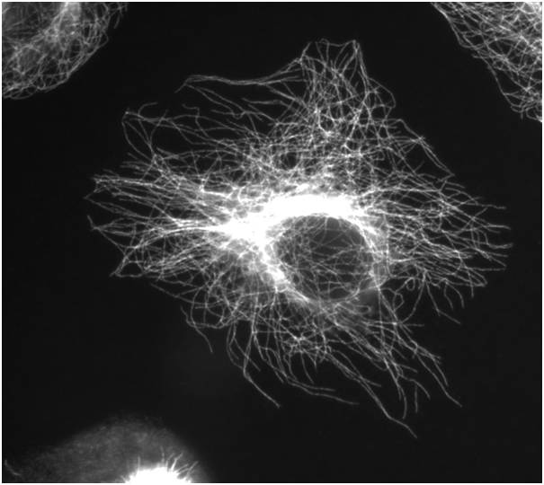 细胞内复杂的微管系统。它们维持着细胞的形态,并支持着细胞内各种物质的运输。(中间没有微管的中空圆球为细胞核所在的位置)