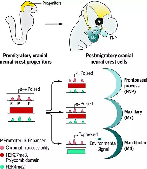 神经嵴细胞能保持染色质的可塑性,所有的基因都准备响应环境信号。当细胞暴露于这些信号时,会发生一个从稳定的到活跃的染色质状态的切换,诱导产生下巴、额头或颧骨的位置特异性转录程序进行转录。