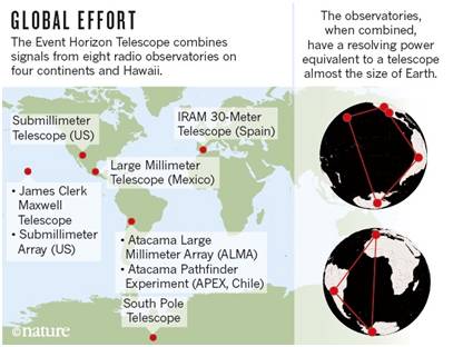 科学家们之前可以利用单个望远镜实现黑洞周围恒星位置的测量,但是,相较于恒星与黑洞之间的距离尺度(1万亿公里),视界面的尺度太微小了(至少小10万分之一倍),因此利用单个镜面很难完成。这时候,为了增强空间分辨率,我们就需要使用“干涉”技术了,即利用多个位于不同地方的望远镜在同一时间进行联合观测,最后将数据进行相关性分析之后合并,这一技术在射电波段已相当成熟。在这种情况下,望远镜的分辨率取决于望远镜之间的距离,而非单个望远镜口径的大小,所以,视界面望远镜的分辨率相当于一部口径为地球直径大小的射电望远镜的分辨率。